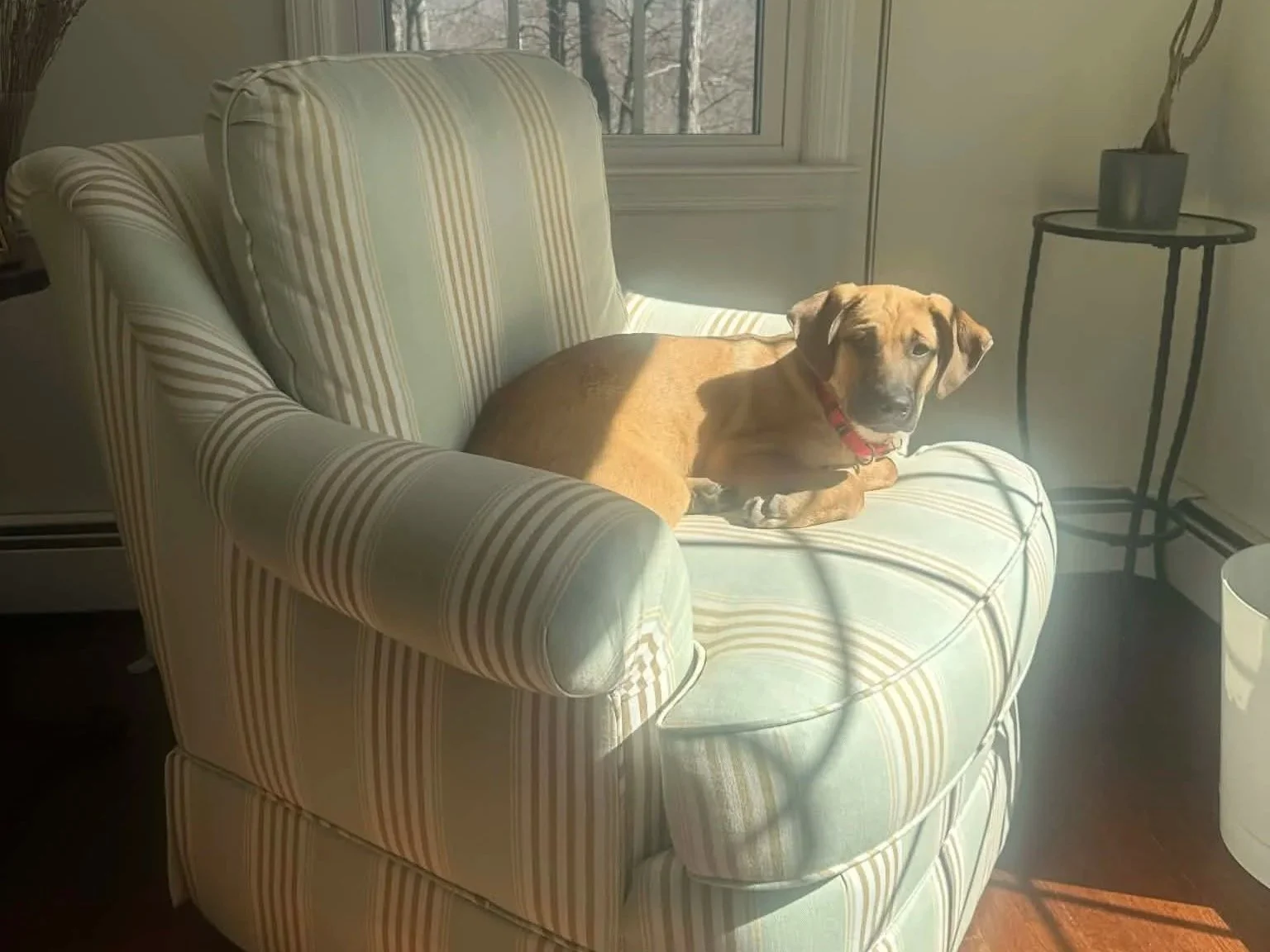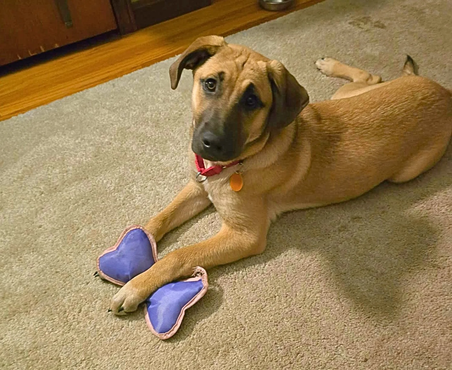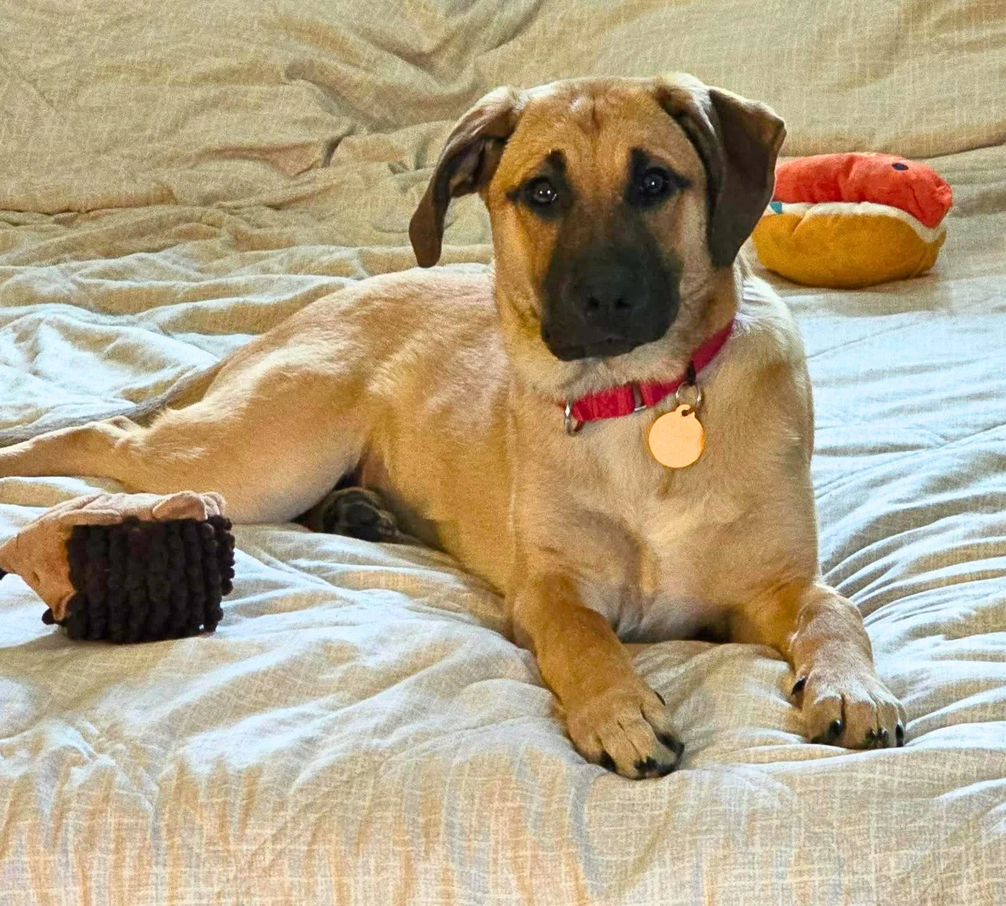 Meet Kiki! This adorable 5 month old Black Mouth Cur mix (maybe a little Ridgeback and Lab too!) is the full puppy package. She is about 30 pounds and expected to be about 50-55 when full grown. Kiki is a happy little lady who loves to play with both her human foster siblings and her canine foster siblings! She is super respectful of everyone around her. She is housebroken, crate trained and walks great on a leash. She loves all the people she has met (including young kids whom she has lived with) and is great with other dogs. Kiki is housebroken and crate-trained. She is always excited to meet new humans and dogs and will greet you with enthusiasm! We are unsure on cats; we are convinced Kiki will just want to play. She has not a mean bone in her body!