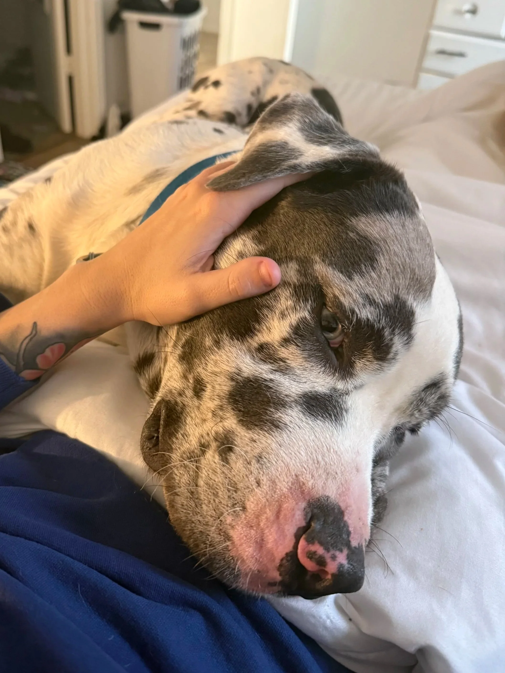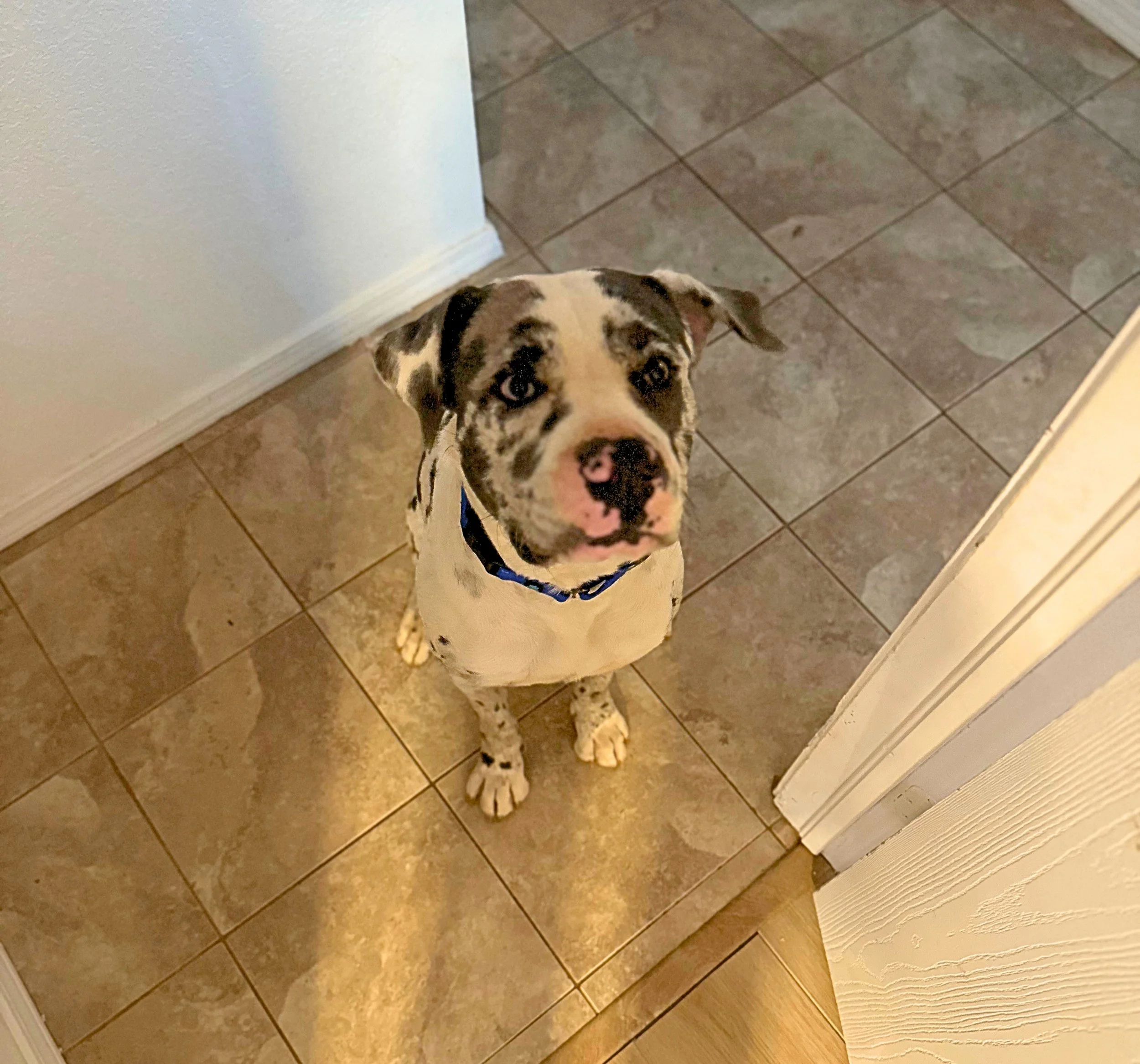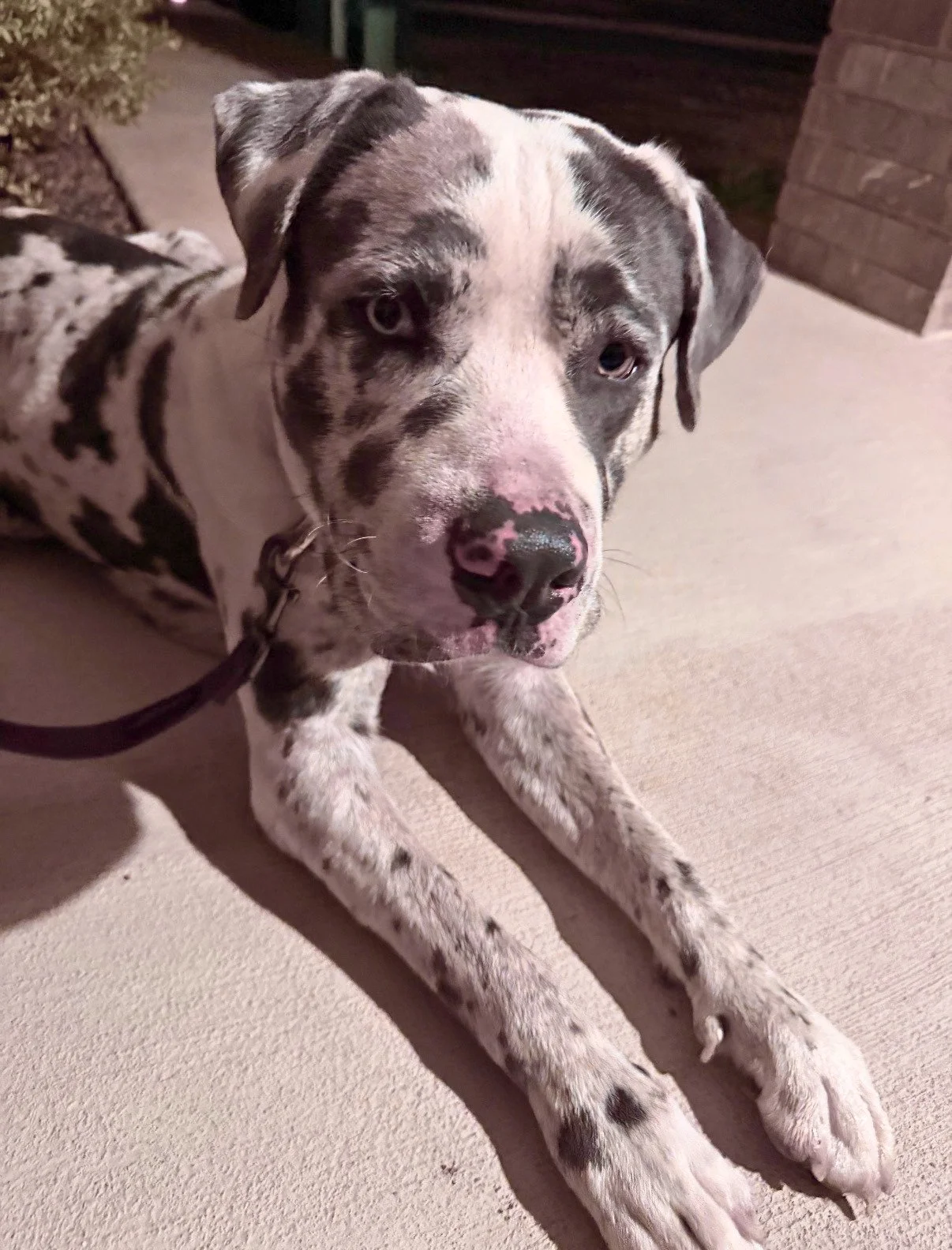 My name is MooMoo. I am a stunning 80 lb Dane/Catahoula/Pit Bull mix. We can't be 100% sure what my make up is but my Harlequin coat harkens to Dane and Catahoula while my broad head could be pittie or Mastiff! I am a lovely dog who was lucky enough to picked up from running the streets. I was happy to have a home again with food and beds; and, humans that care for me. I love my people. I live with two kids under 10. I am housebroken, I am pretty mild in terms of energy. I like to hang out, plays in my yard and follow my humans around. I am sort of a velcro kind of fella. I am dog friendly, I live with another big dog (but she is smaller than me). I need a minute to understand the lay of the land when introduced to something new but it takes me little time to recognize good things. I am crate-trained but I need a crate that I cannot escape. A wire crate is too easy for me! But, an airline or another type will do. I know I can't escape and will just hang out and relax. I also have be left alone for a bit of time out of the crate. I walk well on leash and have not been a puller thus far.